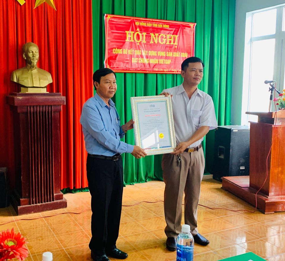 Ông Trương Thanh Tùng - Phó chủ tịch UBND Tỉnh Dak Nông trao chứng nhận VietGAP cho Hội xoài VietGAP Đăk Gằn do Tổ Chức Chứng Nhận VSCB cấp.