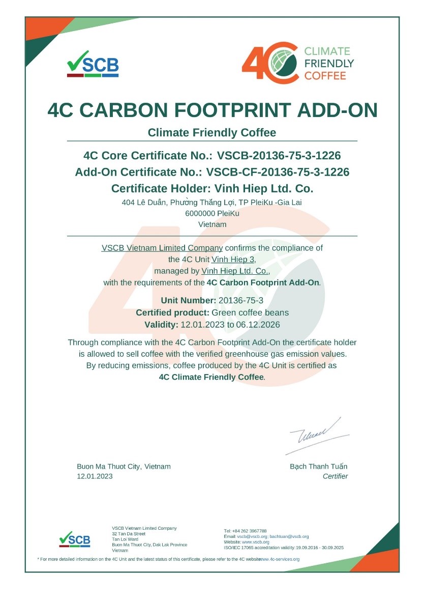 Chúng tôi vui mừng chia sẻ với quý vị rằng Công Ty TNHH Vĩnh Hiệp, là đơn vị sản xuất cà phê đầu tiên tại Việt Nam đạt chứng nhận 4C Mở rộng Dấu chân Các-bon. Đây là một trong 3 chương trình chứng nhận mở rộng của 4C.